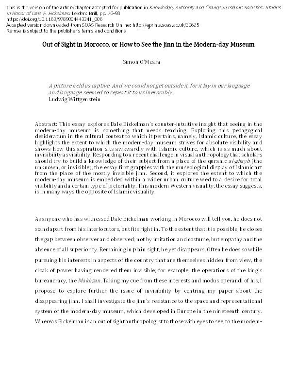 •Aug, 2021•Open accessThis chapter explores Dale Eickelman’s counter-intuitive insight that seeing in the modern-day museum is something that needs teaching. Exploring this pedagogical desiderat...in detail